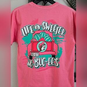 Vibrant pink tee featuring a fun Buc-ee's graphic with a watermelon truck design. Perfect for casual wear. Size small. In great used condition!