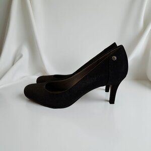 These LifeStride Soft System black pumps have a 2 inch heel and are super comfortable. They have a glitter finish and a small round metal embellishment on the side. Size 7 M