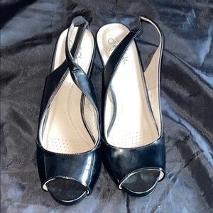 Experience elegance with Life Stride's black stiletto heels, featuring a pointed toe and a chic slingback strap for a secure fit. The patent finish adds a touch of sophistication, making them perfect for formal or business settings. Enjoy a blend of style and comfort with these timeless heels.