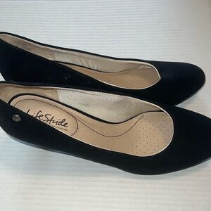 Keywords: Life Stride shoes, black heels, suede heels, pointed toe shoes, low wedge, comfort shoes, work shoes, dress shoes, womens footwear, everyday heels, classic style, elegant shoes