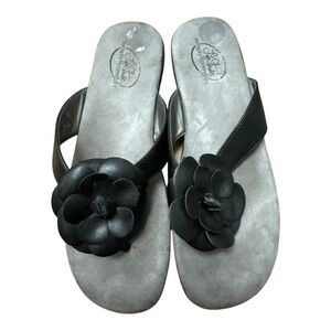 Step into elegance with Life Stride's black and gray sandals, featuring a chic flower embellishment on the thong-style strap. The light gray footbed complements the sleek black straps, while the flat sole ensures comfort for all-day wear. Perfect for casual outings, these sandals are a stylish addition to any wardrobe.