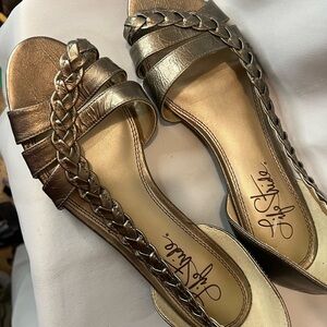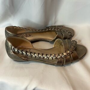 These gold flats by Life Stride feature a stunning woven detail across the top, offering a blend of elegance and modern style. The metallic finish adds a touch of sophistication, making them perfect for both casual and semi-formal occasions. With a comfortable flat sole, they ensure all-day wearability.