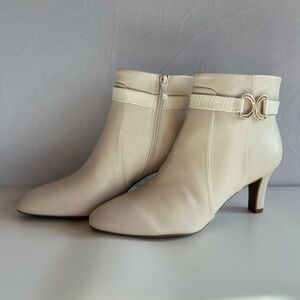 Elegant cream ankle boots. Sleek design with subtle buckle detail. Perfect for any occasion.