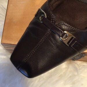 Good quality leather uppers. Square toes which are on trend now and a 1” heel. Cushy footbeds should make these comfortable as well as stylish.