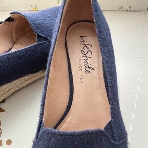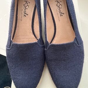 EUC -- These comfortable navy espadrilles were worn only once and are in like-new condition. Fabric upper with an almond toe, slip-on fit, soft fabric linings, built-in stretch, and espadrille wedge. Heel height is 1.75".