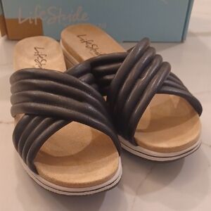 Life Stride Panama Women's Black Criss Criss Slide Comdort Sandals 8.5 Wide