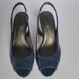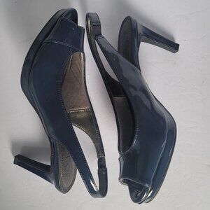 Life Stride Soft System Invest Slingback Pumps with a peep-toe, a high heel, and cushion. The upper is typically made of faux leather with a patent finish.
