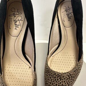 Life Stride Sasha preowned size 7.5 women's shoes black with leopard print half black half leopard. Pump heel, pointed toe slip on shoe traction for more stability flex sole.
