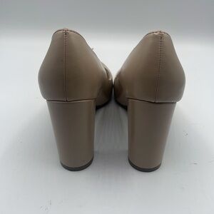 These Life Stride tan heels feature a smooth leather-like finish and a comfortable block heel, perfect for professional settings. The rounded toe and clean silhouette offer a timeless design that complements various outfits.