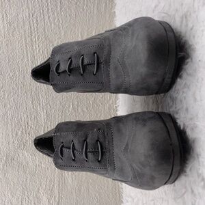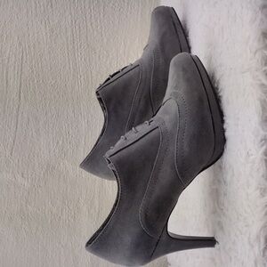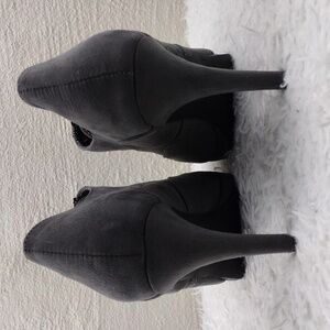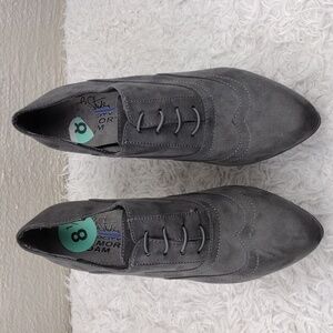 Life Stride Velocity Memory Foam Women's Grey Faux Suede Fabric Upper Pointed-Toe Four Hole Faux Lace Up Elastic Cord Slip On High Heel Oxford Style Ankle Bootie Shoes. Rubber/Fabric Foot Pad/Sole. Footbed Size Stickers. Upper Heel Mark. Color May Vary Due To Lighting.