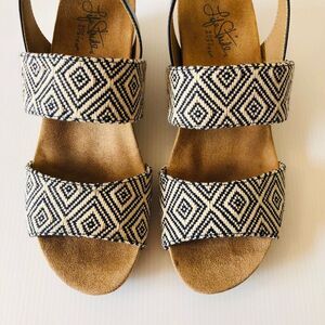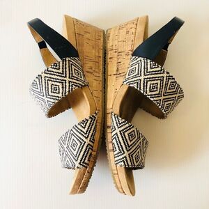 Life Stride Women 8.5M Black & White Marcela Design Wedge Sandals Aztec Design. In pre-owned but good condition. Some wear on one of the straps. Please view last photo.