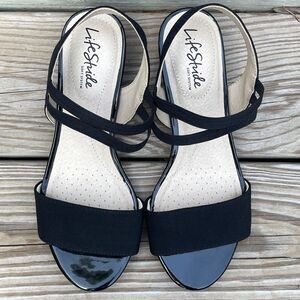 Life Stride Yolo Women's Black Ankle Strap Wedge Sandals Size 7 NWOT