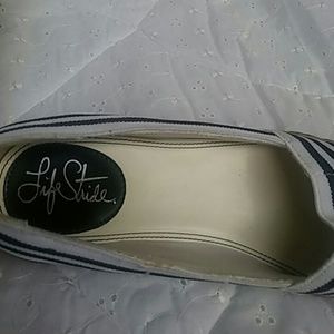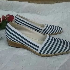 NWOT "Jute" black & white canvass stripes, slip on shoes, padded insoles, rubber outsoles, very comfy!