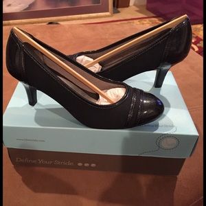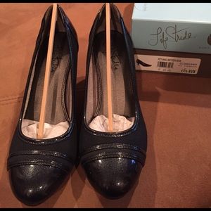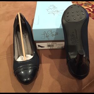 Life Stride Petunia heels in navy blue. Size 6.5 wide. Brand new. Never worn. About 2.5 inch heel. LifeStride Soft System insole for comfort. Heel cap with stripe detail. Manmade upper, lining and outsole. Round toe. Padded footbed.