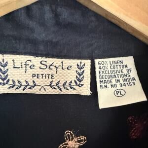 Life Style Black Linen cotton Blend Floral Embroidered Tunic Shirt Petite Large