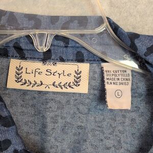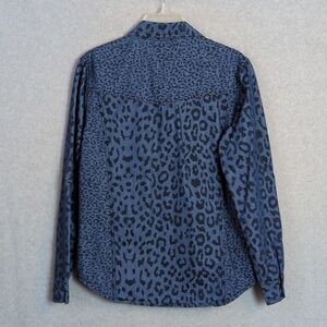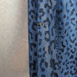Life Style Blue Denim Animal Print Roll Tab Sleeve Button Down Shirt Women's L