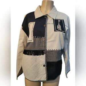 Unique patchwork jacket featuring giraffe designs and fringe details. Stylish black and tan color scheme.