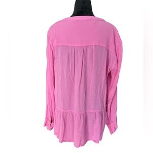 Elevate your wardrobe with this chic and feminine Life Style pink button-down blouse. Crafted from lightweight 100% viscose, this top features a flowy peplum hem, long sleeves with button cuffs, and a flattering V-neckline. Perfect for casual outings, brunch dates, or layering for workwear, this blouse combines comfort and style effortlessly. Its vibrant pink hue adds a pop of color to any outfit, making it a versatile addition to your closet. Gently pre-loved and in excellent condition.