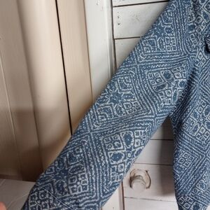 Life Style Women's Large Geometric Print Button-Front Blue Jean Jacket Trucker. It is missing one button, see pictures. Approximate measurements are laying flat armpit to armpit 23" and length from shoulder to hem 24". Slightly cropped. Condition is pre owned, used, good condition.