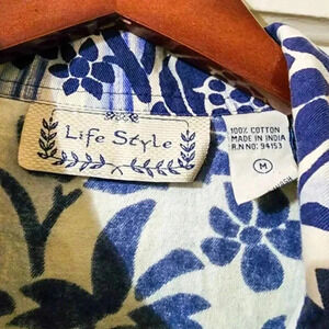 Description: Vintage Y2K boho button-up jacket with a charming blue and beige floral pattern. Lightweight, 100% cotton with a relaxed fit, perfect for layering. Made in India and showcases beautiful bohemian craftsmanship with subtle texture and style.