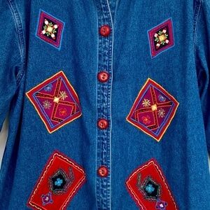 Life Style Y2k Embroidered Patchwork Applique Button Down Denim Jean Shirt Jacket Shachet, Women’s Size Large - Southwest, Western, Hippie, Bohemian, Retro, 80’s, 90’s, Y2K, Rare, One of a Kind, Art to Wear, Layering, Teacher, Crafter