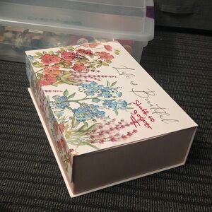 Beautiful floral decorative box with vibrant colors. Very large container. Has some writing on the top cover from when I was moving. Has a magnet to close. Perfect for storage or gifting. Still in good used condition.