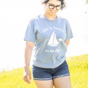 Channel your inner adventurer and embrace the fun life on the lake with the Life is Better on the Lake Graphic Tee. Featuring This tee will show you how fun every day can be when you live in paradise. Featuring an adventurous sailboat ready to set sail along a nature-filled shoreline soft, comfortable 100% cotton fabric, means it will quickly become your go-to tee for all of your outdoor summer activities.