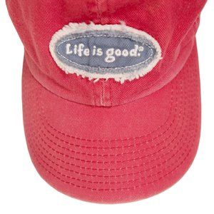 Red "Life is Good" baseball cap with distressed center embroidered patch, intentional fading on bill and allover cap for worn, casual effect