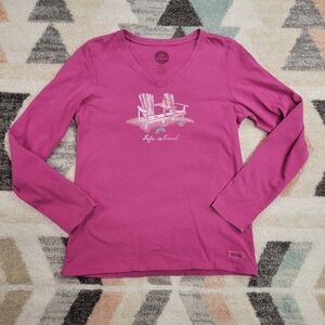V-neck long sleeve women's tee shirt in pink / purple. Adirondack beach chairs with flip flops graphic t size small.