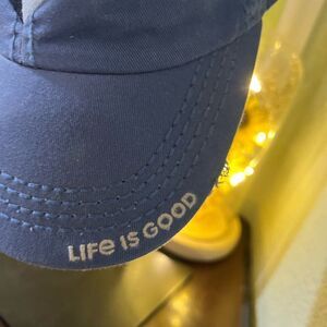 Stylish blue cap with heart design. Features stars and stripes. Perfect for casual wear.