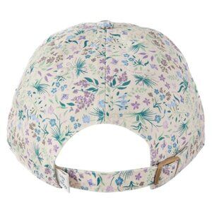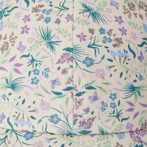This pretty 100% cotton (8.26 oz) cap is adorned with an all over printed graphic of small butterflies flitting around flowers and other garden greenery. The 6-panel fabric cap is garment washed for softness and features an unstructured low-mid crown and six rows of stitching.