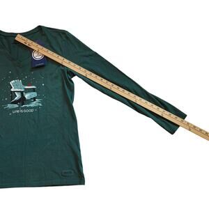 Life is Good Crusher T Shirt Womens Medium Green V Neck Long Sleeve Adirondack
