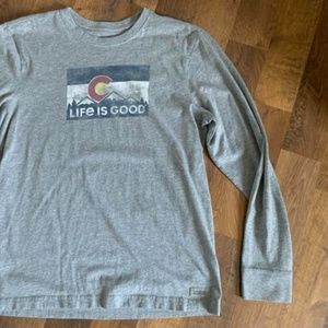 Life Is Good Colorado Edition!! A lightweight version of the classic, long-lasting tees you know and love—pre-washed for softness, fit, and all-day comfort. Fun bonus is that these were made in limited production and only sold in Colorado and that it's rare as it may be a long sleeve prototype that was never made into full production!
