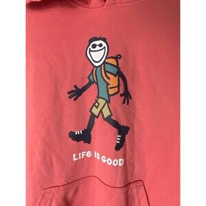 Life is Good hoodie with a hiker on the front. Color is Nantucket red - very muted red making it pink. Men’s size small. The paper tag is missing but the plastic tag holder is present.