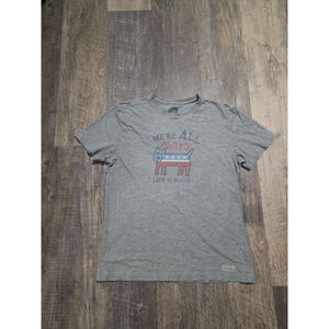 The Life is Good "we're all mutts" Size Small shirt is a stylish and comfortable t-shirt designed for women. Featuring a round neck and short sleeves, this gray shirt in size S is perfect for everyday wear. With the brand's signature philosophy of positivity and inclusivity, this basic tee is a great addition to any wardrobe.