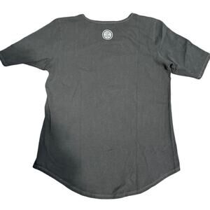 Features: slight waist shape, washed for softness, ribbed neckline, elbow-length sleeves, printed graphic, shoulder-to-shoulder self-fabric taping
