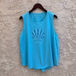 Life is Good sleeveless tank top in a vibrant sky blue color. Size Womens XXL. Features a beachy graphic of a stylized shell made from flip-flop shapes, with “Life is Good” printed underneath. Super soft cotton, lightweight, and perfect for summer days or casual loungewear.
