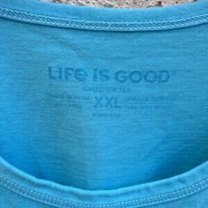 Life is Good sleeveless tank top in a vibrant sky blue color. Size Womens XXL. Features a beachy graphic of a stylized shell made from flip-flop shapes, with “Life is Good” printed underneath. Super soft cotton, lightweight, and perfect for summer days or casual loungewear.