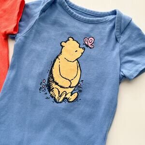 Life is Good Winnie the Pooh Crusher bodysuits, set of 2 Size: Baby 6-12 month Color: Orange with Winnie & Daisies; Blue with Winnie & Butterfly Good preowned condition, no visible flaws 100% Cotton Made in Peru Baby Spring Summer Winnie the Pooh Character Soft CC5