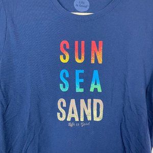 Life is Good Woman's Sz M Classic Fit Crew Neck Navy Blue Sun Sea Sand T Shirt