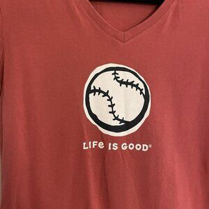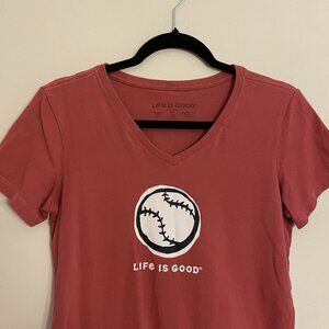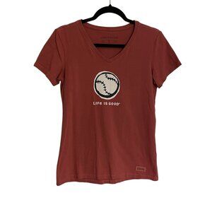 Life is Good Women Sz S Dark Salmon Baseball Graphic Short Sleeve Crusher Tee