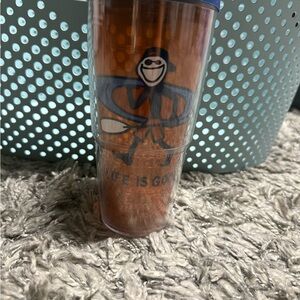 Clear tumbler featuring a blue and orange design. Perfect for drinks on the go.