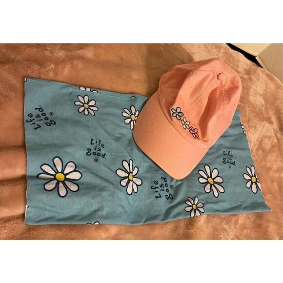 Life is Good Pink Daisy Hat with Blue Life is Good Neck Gaitor