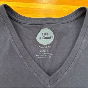 Life is Good dragonfly short sleeve tee shirt. Crusher tee. Classic fit. V neck. 100% cotton. Armpit to armpit 18 inches. Length 23 1/2 inches. Size petite small. Good condition.