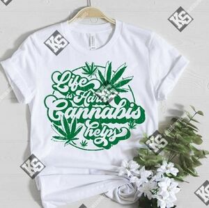 Life is Hard. Cannabis Helps. A tee with the signature leaf is sure to be a conversation starter. Available in all sizes, crew or vneck. Made when ordered. Please allow 1-2 weeks production time. Get yours today!! This design is available on a hoodie or hoodie dress for $40. This is a unisex tee.