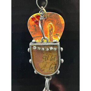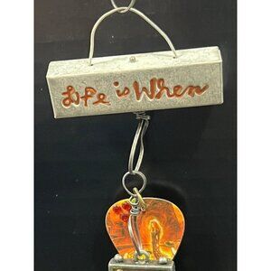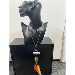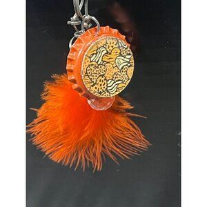 “Life is when” orange feather animal print bottle cap guitar pick necklace.