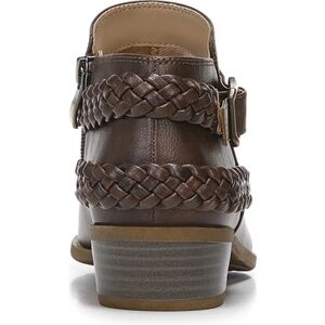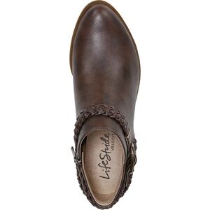 FLOOR SAMPLE Life stride memory foam round toe and decorative buckle at ankle wraparound braided detailing Adriana booties with 1.25 heel in brown size 7.5W 1.25" heel Shaft height: 4.09", circumference: 10.24", measured on a size 6M SiSide Zipper Memory foam featured Synthetic upper, Synthetic lining, Synthetic sole Spot clean Imported