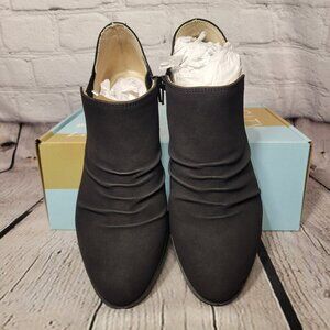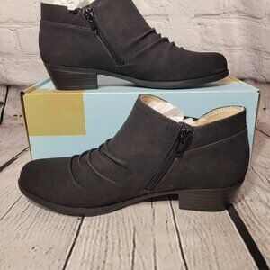 My "I'll be wearing this shootie all season" shoe. The ultra-comfortable Aurora from LifeStride will be on constant rotation in your closet. Microsuede or faux leather upper with an inside zip, stretch gore panels, and ruched detailing. Soft System® comfort package provides all-day support, flex, and cushioning. Traction sole provides you with extra stability. Just Right Height 1.5-inch stacked heel.