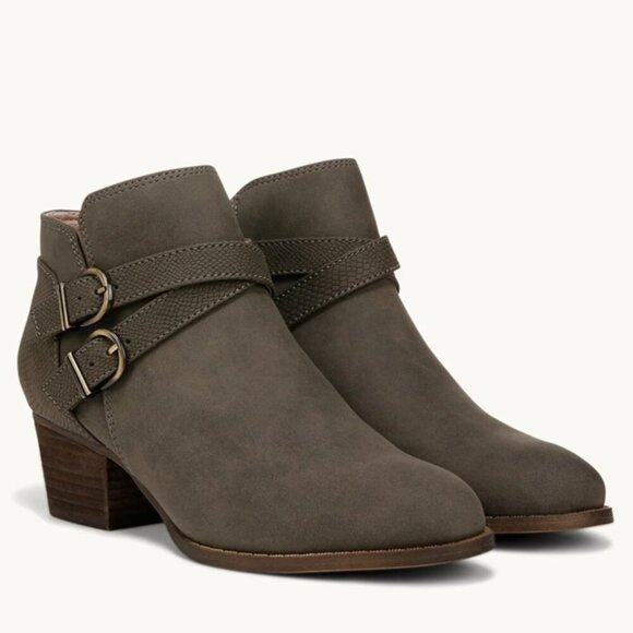 Make the Western trend work for your wardrobe in this cool Western ankle boot. Faux leather upper with a round toe, decorative straps with buckle details, built-in stretch, and functional inside zip. Linings partially crafted with recycled materials.