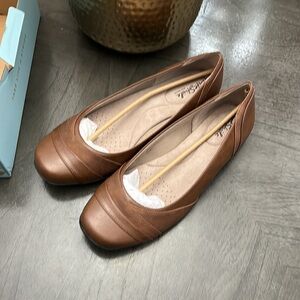 Versatile and timeless, you'll find yourself wearing this flat again and again. Faux leather upper with layered detailing at the toe and heel.